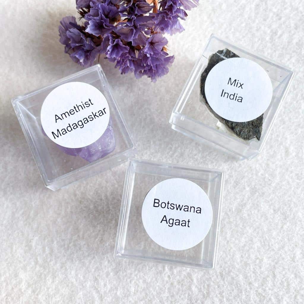 Elk doosje heeft een sticker met daarop de naam en de herkomst van de steen.