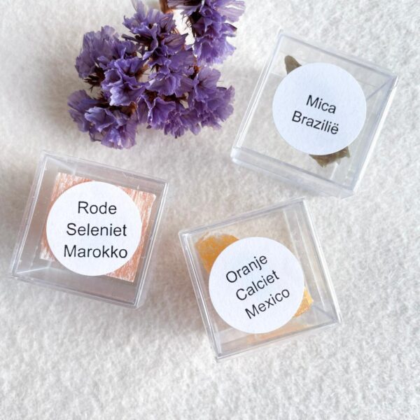 Elk doosje heeft een sticker met daarop de naam en de herkomst van de steen.
