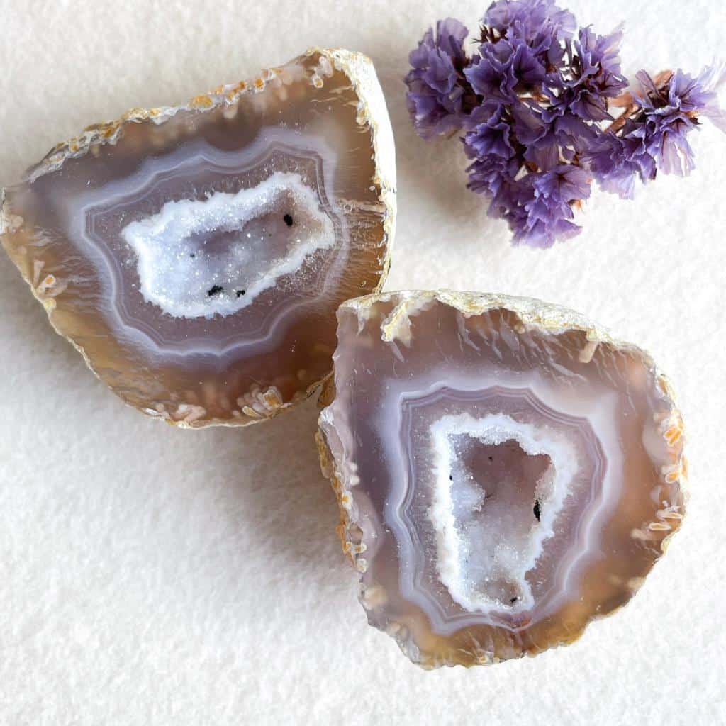 Paar van 2 agaat geode helften met veel druzy in de holte.