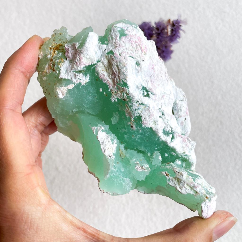 Oh wow, dit is even wat anders. Ruwe chrysopraas in een bijzonder mooie groene kleur. Het wit dat je ziet is kalk.