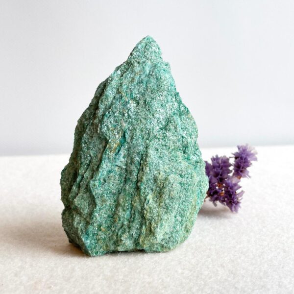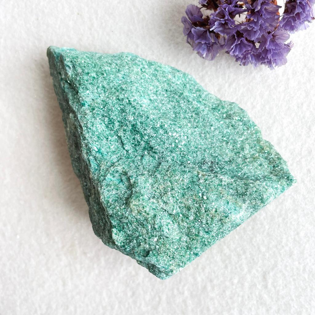 Ruw sculptuur met standvlak van groene fuchsiet met veel (natuurlijke) glitter.