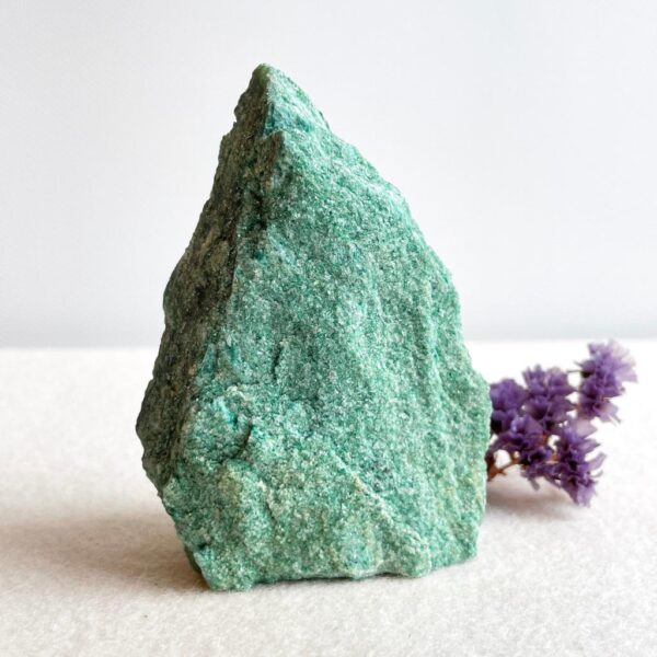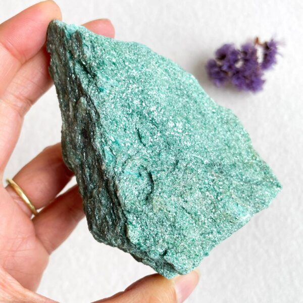 Fuchsiet is een groene variant van muscoviet die prachtig kan glitteren in het licht door het chroom wat in de steen zit. Het is een zachte steensoort en heeft een zeer positief effect op mensen.
