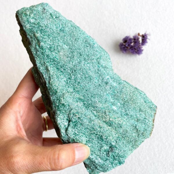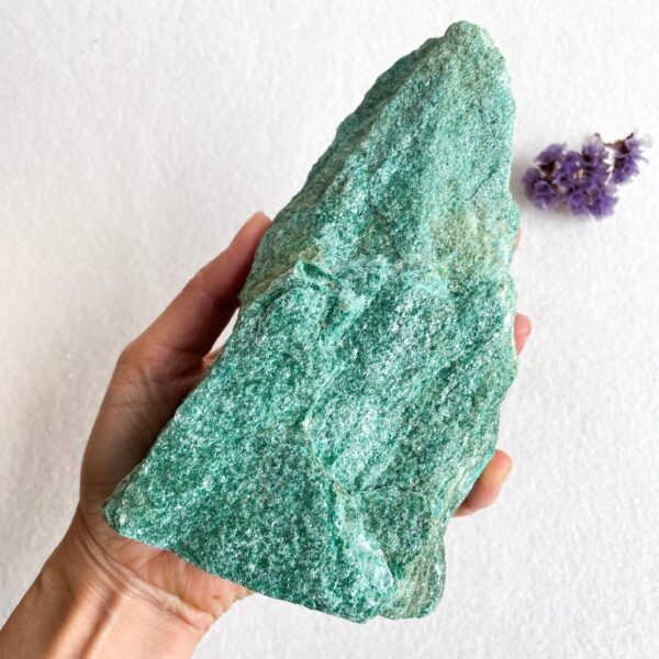 Fuchsiet is een groene variant van muscoviet die prachtig kan glitteren in het licht door het chroom wat in de steen zit. Het is een zachte steensoort en heeft een zeer positief effect op mensen.