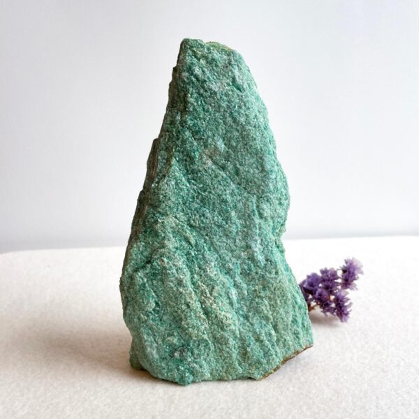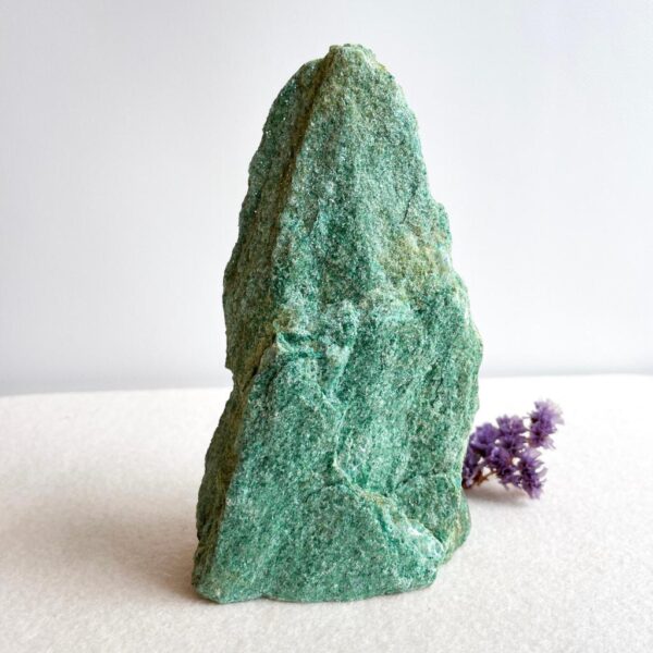 Ruw sculptuur met standvlak van groene fuchsiet met veel (natuurlijke) glitter.