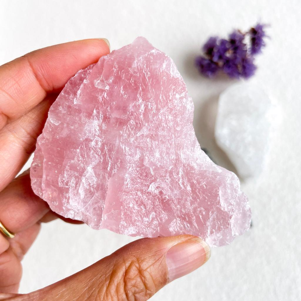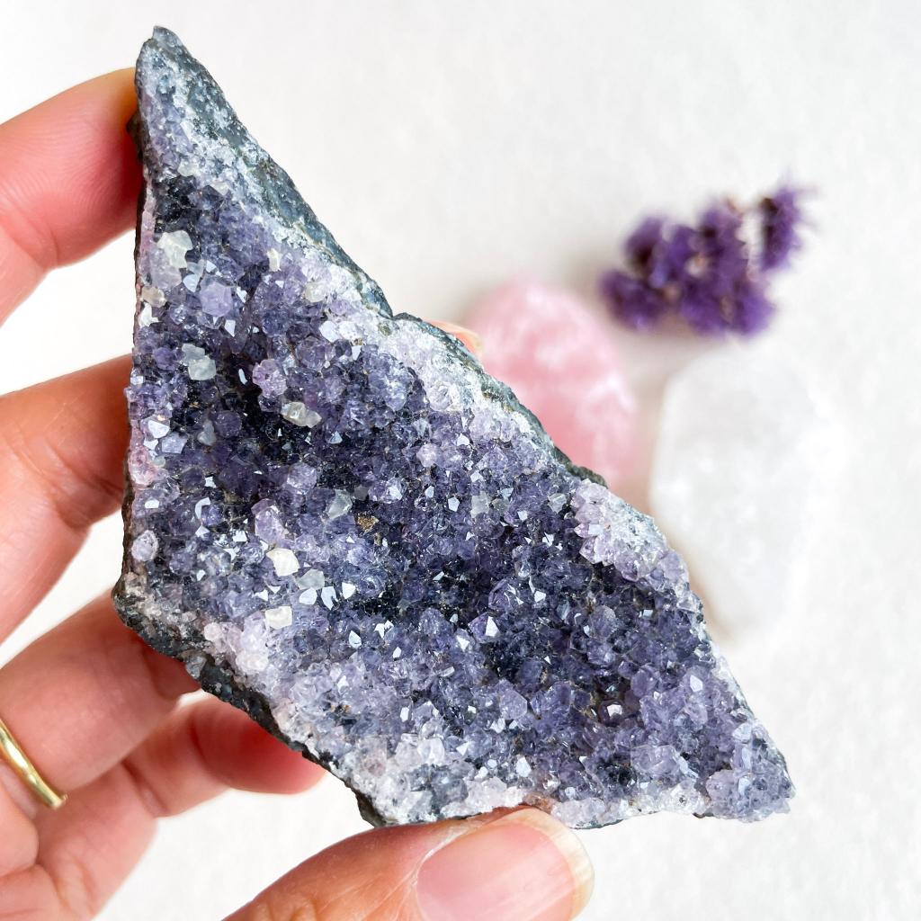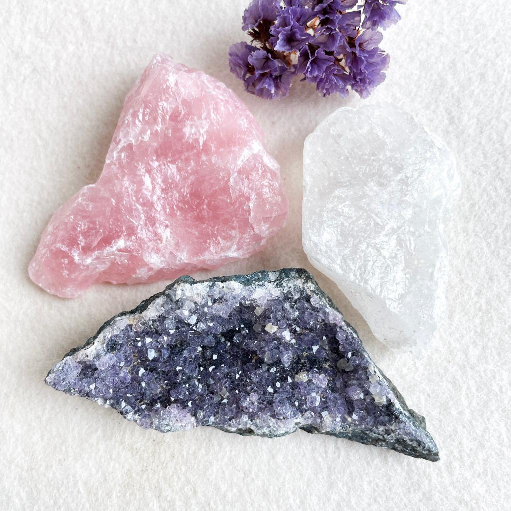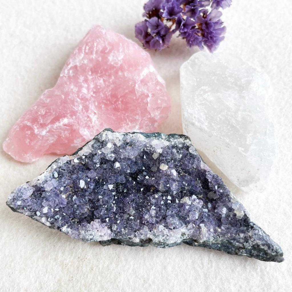 Een mooie combinatie van ruwe bergkristal en rozenkwarts uit Braziliƫ en een amethist geode stuk uit Uruguay. Op de amethist vind je ook een paar kleine calcietkristallen, een mooie extra toevoeging aan deze gouden driehoek set.
