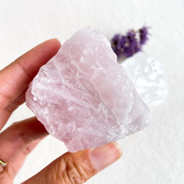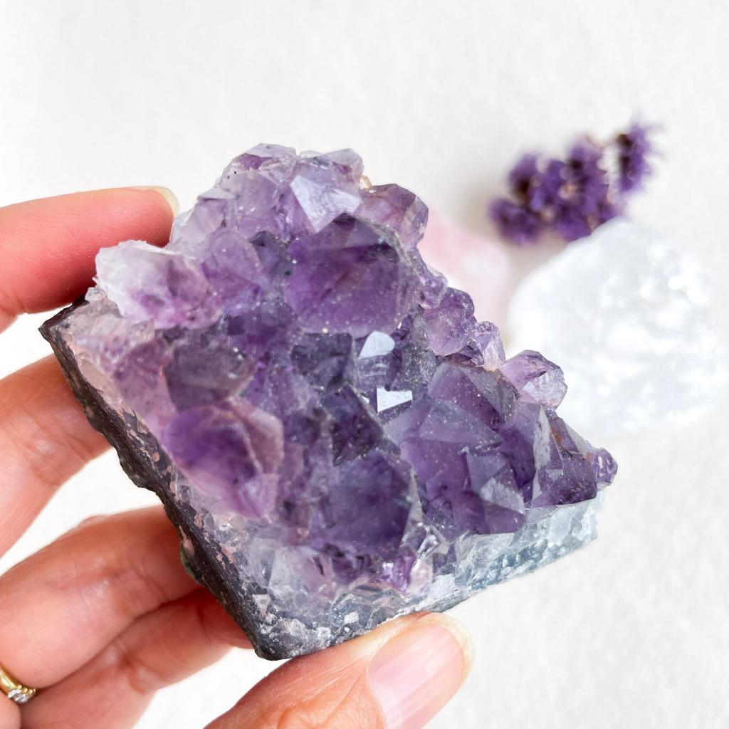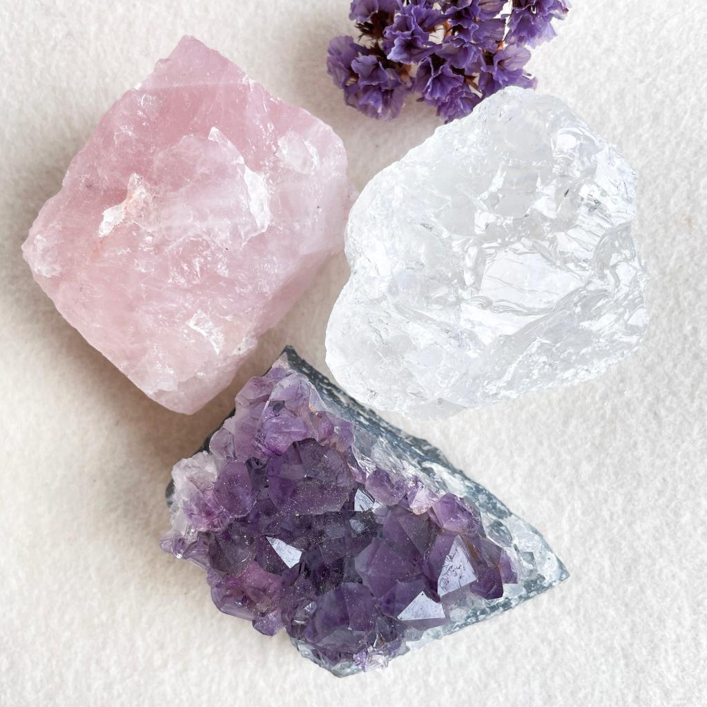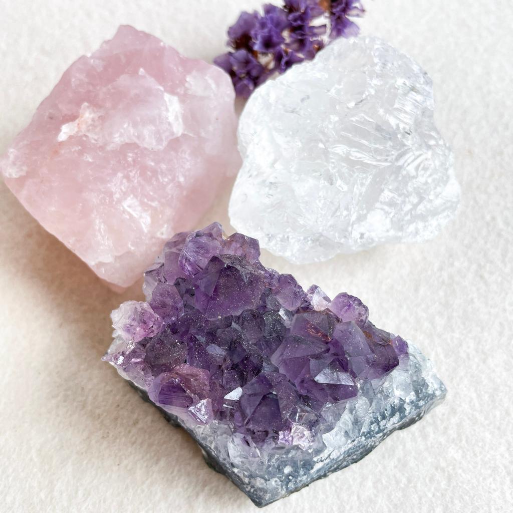 Een mooie combinatie van ruwe bergkristal en rozenkwarts en een amethist geode stuk uit Braziliƫ.