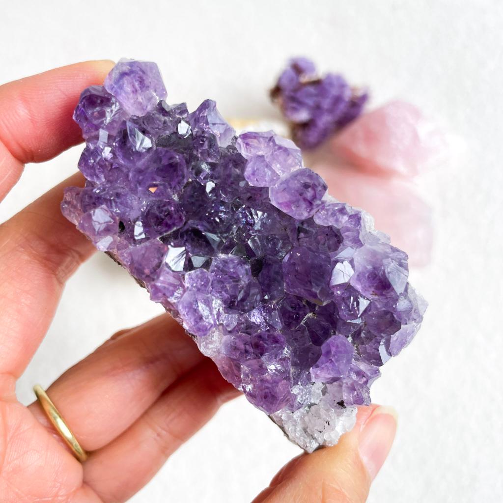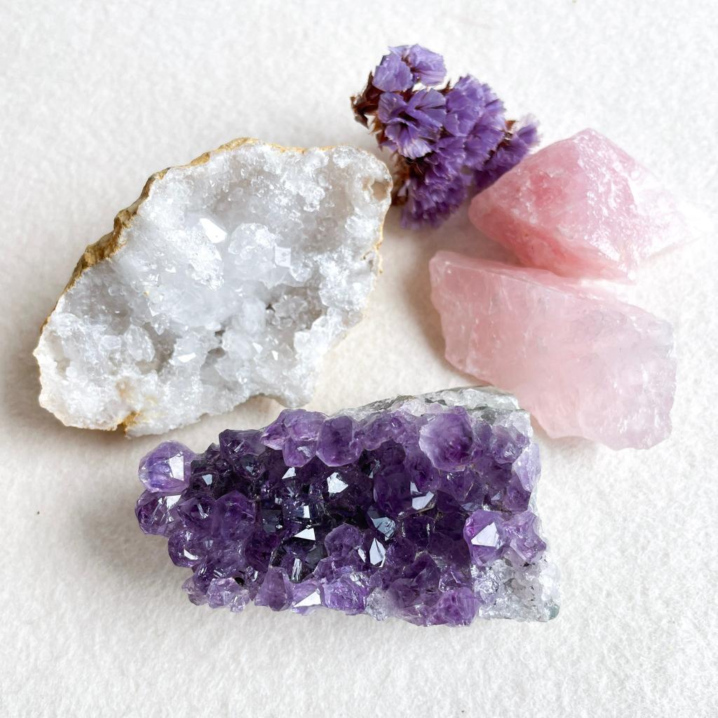 Een mooie set van amethist uit Uruguay, bergkristal uit Marokko en 2 stukjes rozenkwarts uit Braziliƫ.