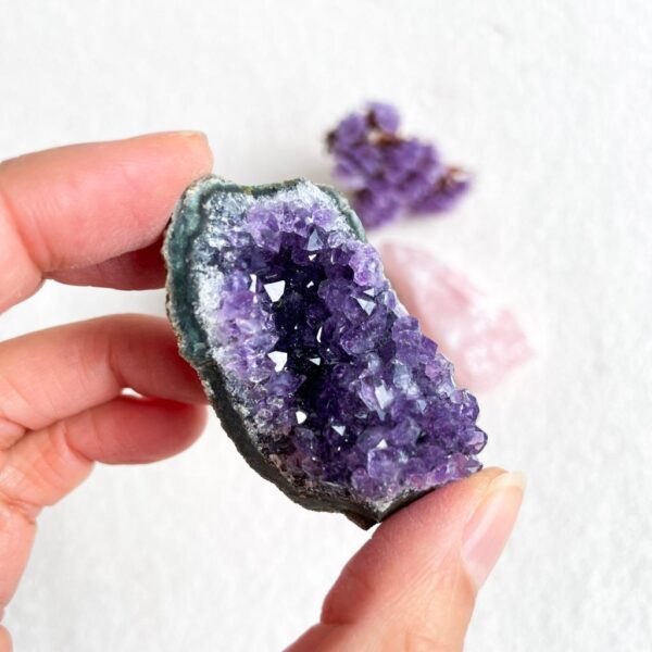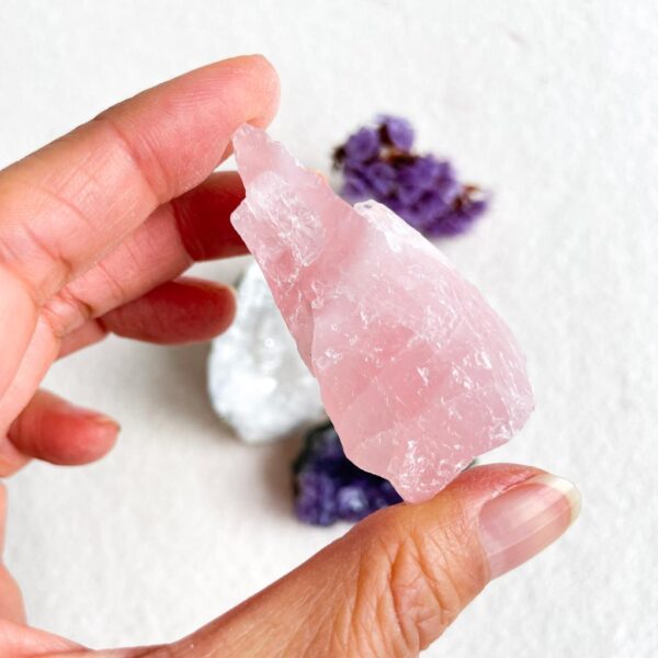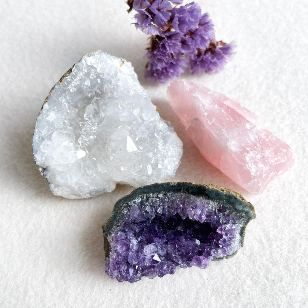 Een mooie set van amethist uit Uruguay, bergkristal uit Marokko en rozenkwarts uit Braziliƫ.