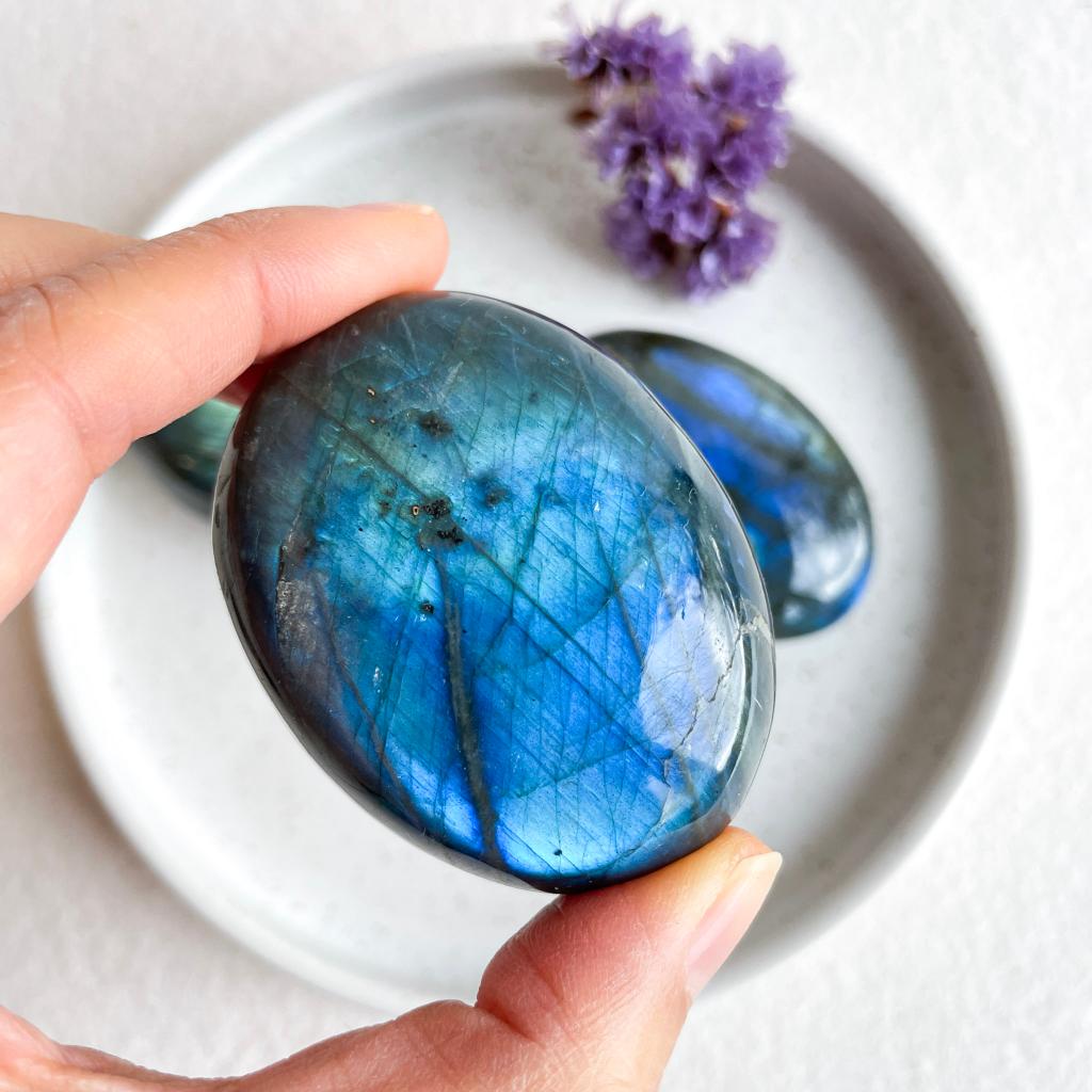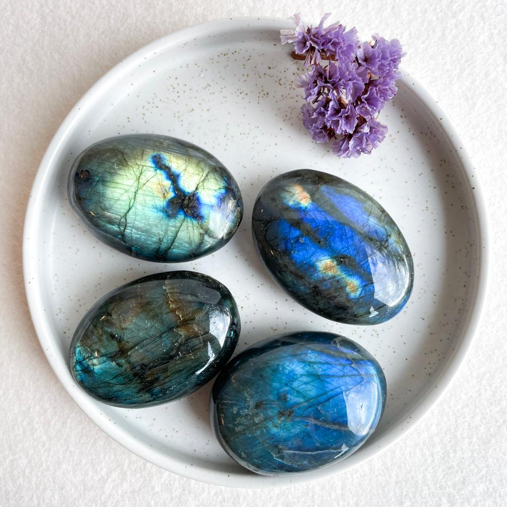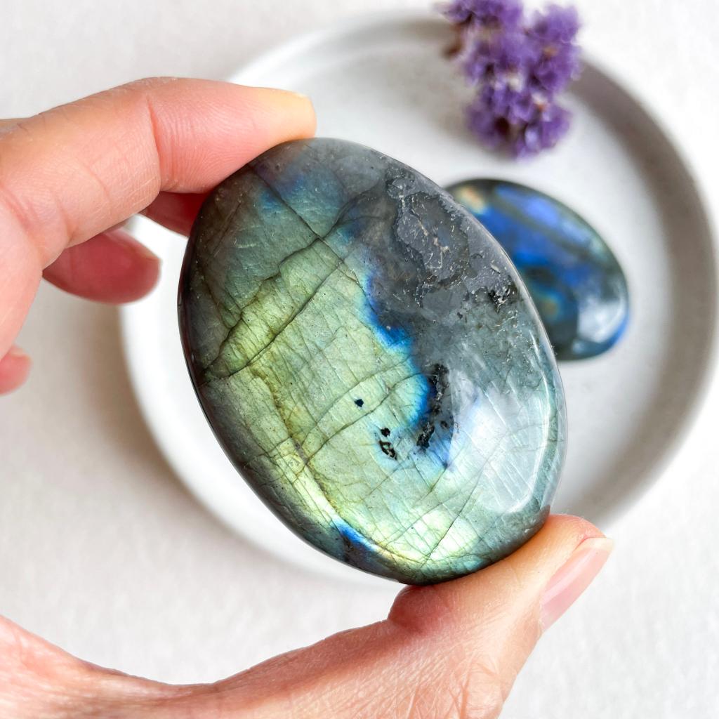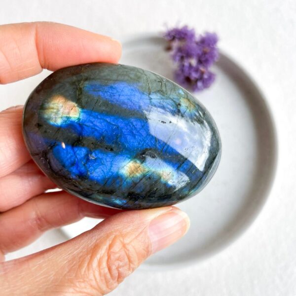 Mooie gepolijste handsteen van goede kwaliteit labradoriet uit Madagaskar. Elke steen is geselecteerd op de aanwezigheid van veel flash.