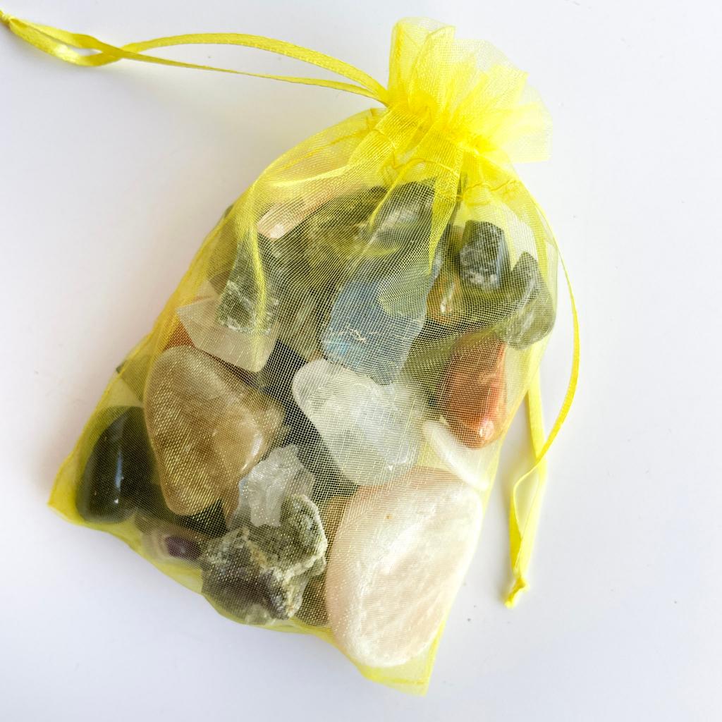 Je ontvangt een organza zakje vol met trommelstenen en ruwe stenen die van minder goede kwaliteit dan het reguliere Dyona assortiment of (licht) beschadigd zijn. Er zitten ongeveer 10 grotere stenen in en heel veel kleintjes. Het totaal gewicht is 300 gram.
