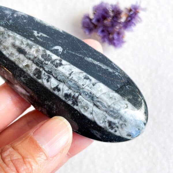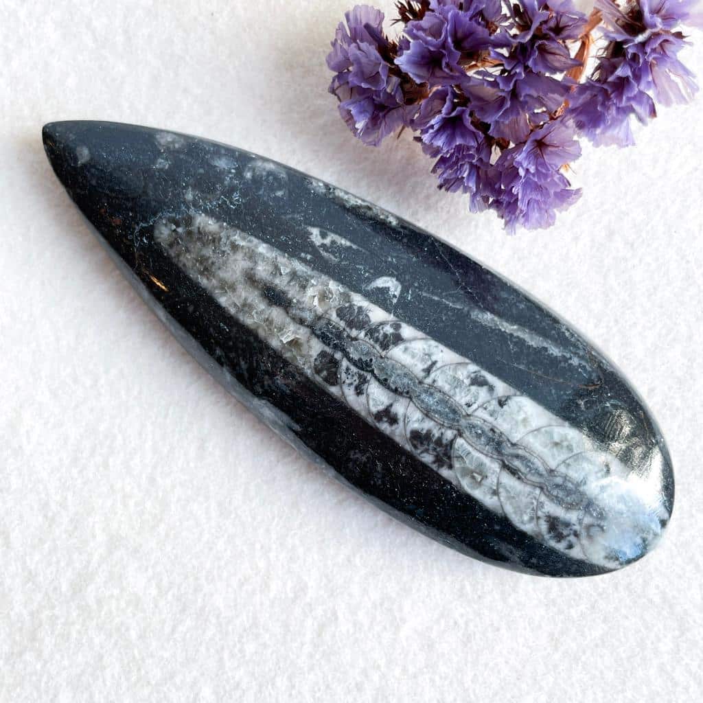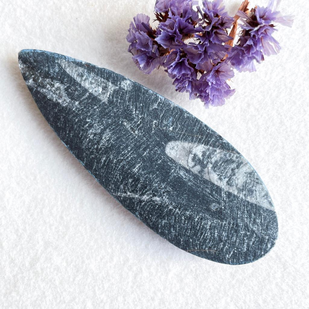 Mooie orthoceras fossiel. De bovenzijde is glad gepolijst, de onderkant is wat ruwer. Het witte is de ‘wervel’ van een inktvis die 400-500 miljoen jaar geleden leefde op aarde.