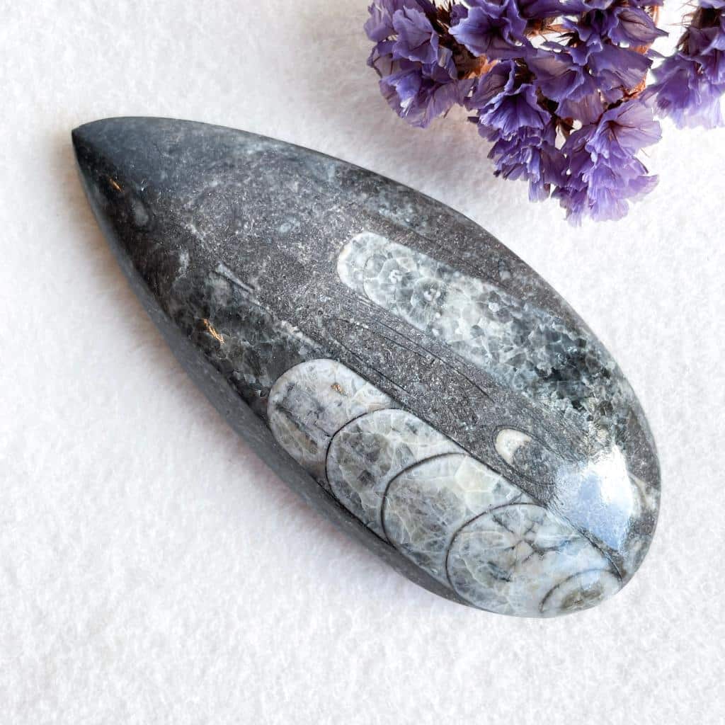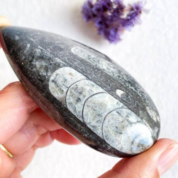 Mooie orthoceras fossiel. De bovenzijde is glad gepolijst, de onderkant is wat ruwer. Het witte is de ‘wervel’ van een inktvis die 400-500 miljoen jaar geleden leefde op aarde.