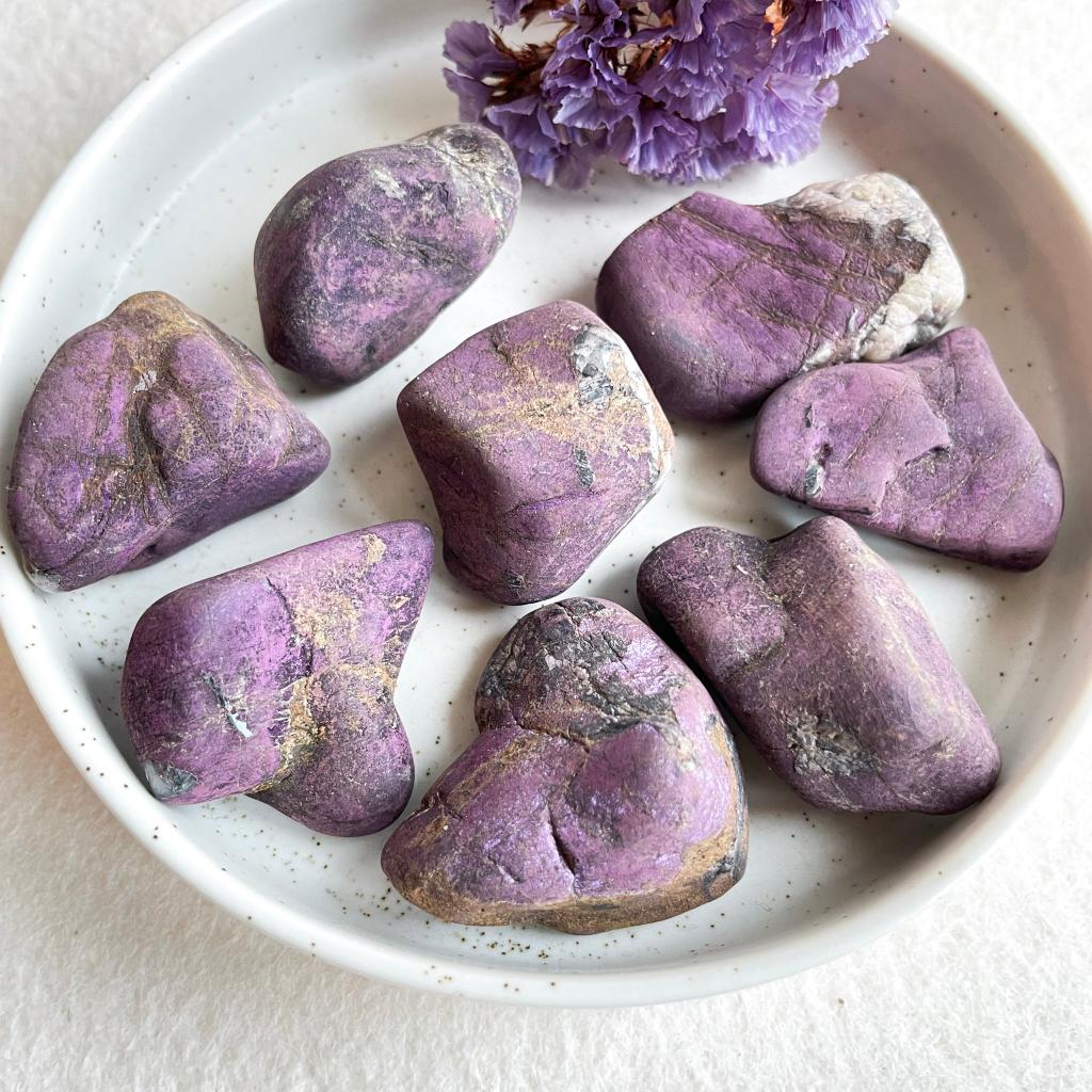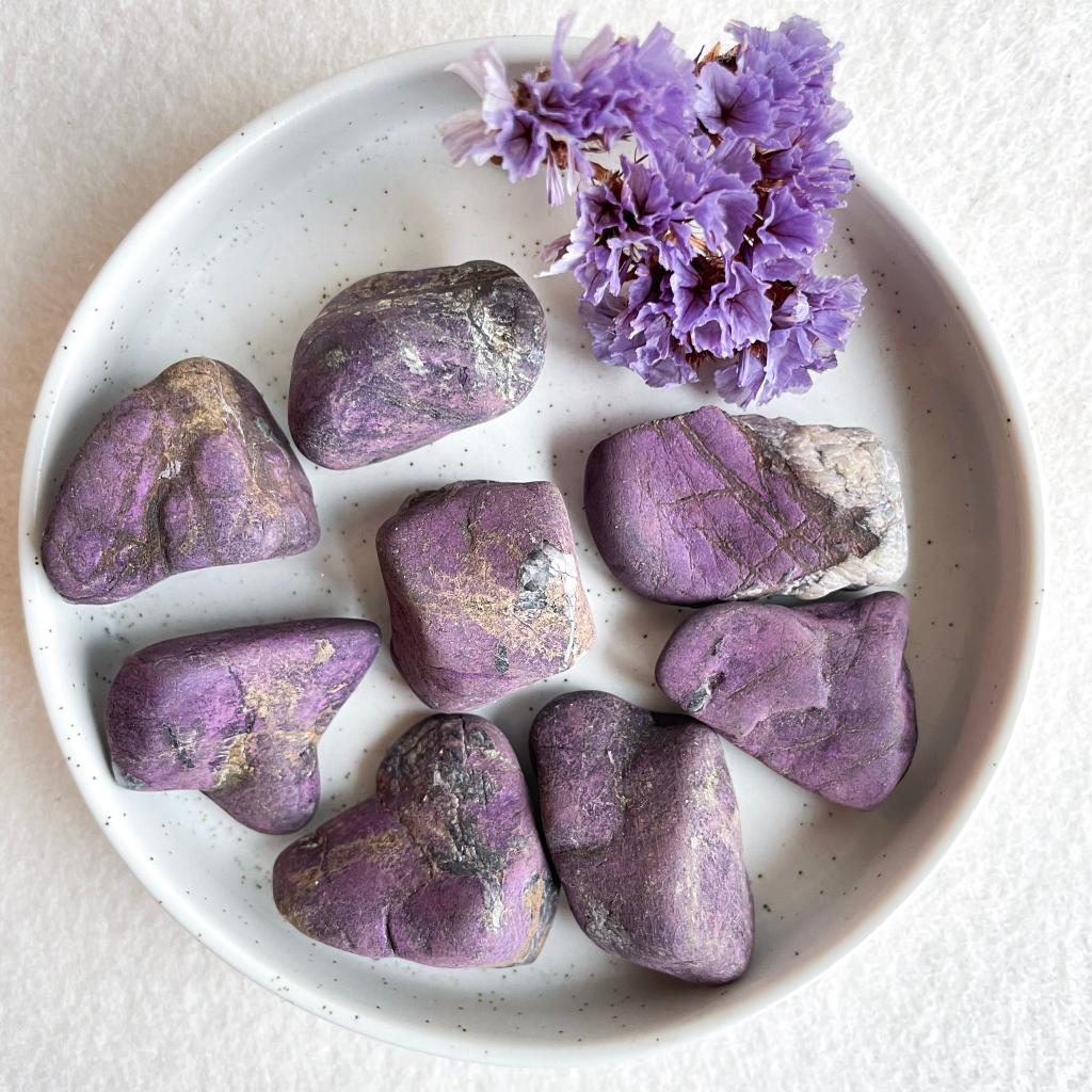 Daarnaast werkt ze als een verbinder, en houdt het evenwicht tussen het aardse en het spirituele bestaan. Purpuriet stemt de chakra’s op elkaar af, zodat energie vrij kan stromen.