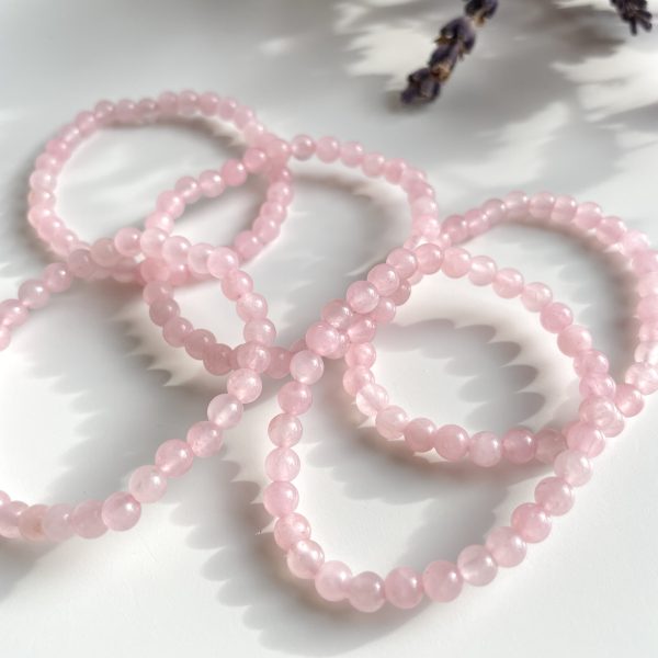 Lief armbandje van lichtroze rozenkwarts. De kralen zijn rond en hebben een doorsnede van 4mm.