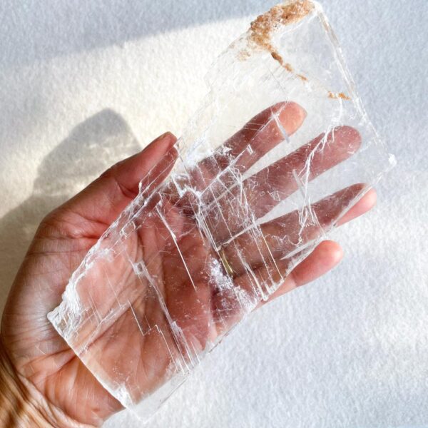 De meeste seleniet die je bij Dyona vindt heet officieel satijnspaat. Dit is een ondoorzichtige variant van gipskristal. De ruwe versie van satijnspaat is vezelig, de gepolijste heeft een satijnglans. Het kristal wat officieel seleniet is, is zeldzamer en meer glasachtig en helder.