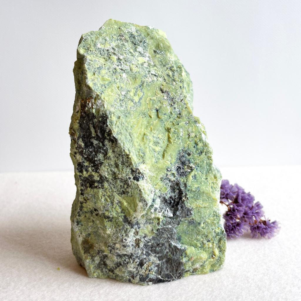 Dit is mooi! Een sculptuur met standvlak van serpentijn met sporen van pyriet.