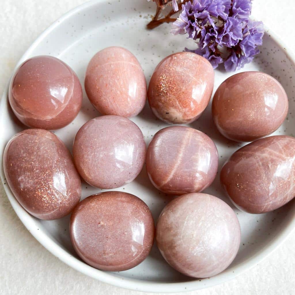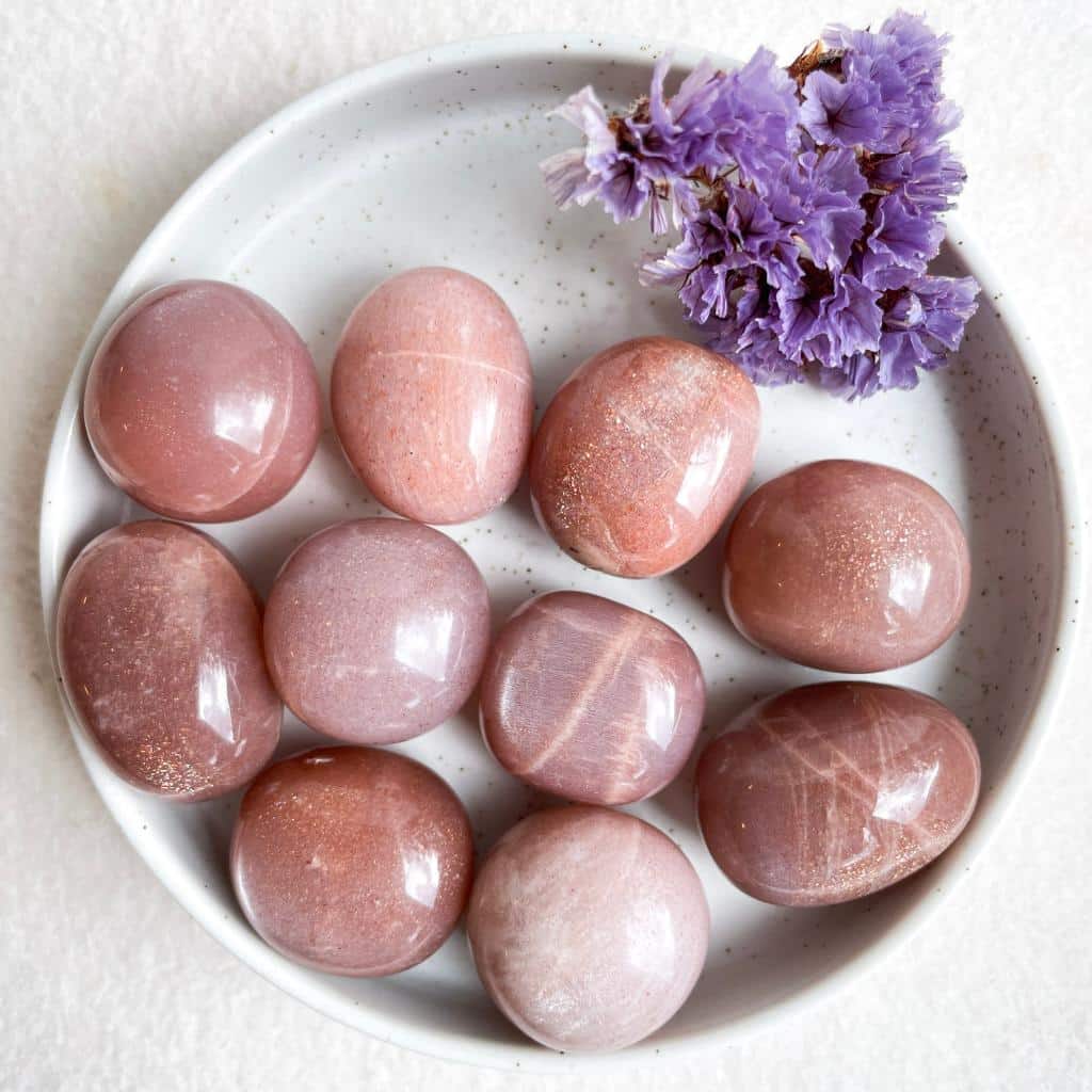 - Roze/perzik maansteen staat voor groei en zachtheid. Ze werkt troostend en is een fijne, zachte steen voor moeders.