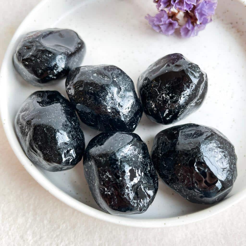 Dyona verkoopt verschillende soorten obsidiaan. Om de juiste steen te kiezen, kan je kijken naar de omschrijving van de steen of voel je zelf welke steen bij je past.